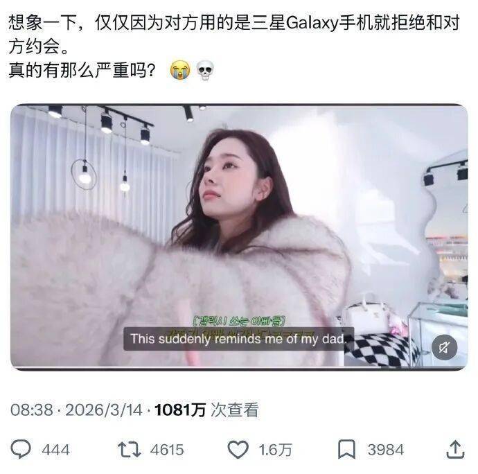宋智雅在美甲店闲聊时表示:“如果男友用三星Galaxy手机会很讨厌、很烦人”。她解释的具体原因包括:曾因父亲用三星将其拍成“三头身”留下阴影,担心男友用三星拍自己效果不佳。暗示三星用户多为“老年人和爸爸辈”,年轻人使用“观感不好”。自称几乎没摸过三星手机,惯用iPhone。后补充说明三星Galaxy Flip折叠屏设计“很好看”。