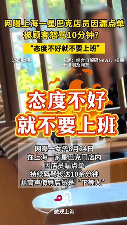 8月24日,有顾客发视频称,上海一星巴克门店内一名女子持续辱骂店员长达10来分钟“态度不好不要出来上班”“不知道自己几斤几两”“拽得不行”……但是,店员始终默默忍受。拍摄者表示,原本美好的心情被该女子破坏,因无法忍受选择走人。