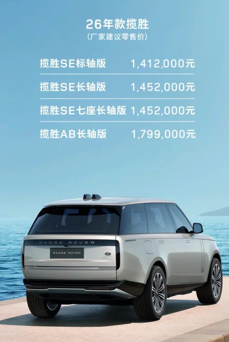 本次上市的 2026 款揽胜车型布局清晰,精准匹配不同高端用户的用车需求:揽胜 SE 标轴版定价 141.2 万元,主打经典豪华与操控体验;揽胜 SE 长轴版、SE 七座长轴版同价 145.2 万元,在标轴版基础上升级空间表现,兼顾家庭出行与商务接待;而揽胜 AB 长轴版以 179.9 万元成为全系旗舰,定位 “少数人的豪华天花板”,也是本次改款上市的核心亮点,从配置到体验全面拉满,重新定义高端豪华 SUV 的标杆。