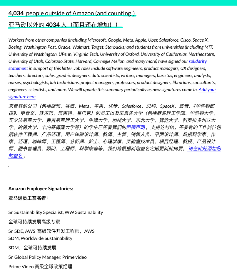 亚马逊的员工们不想坐以待毙,他们发起了联合签名行动,不仅鼓励员工们参与, 也呼吁外部人士加入进来,目前已经有超过四千多人参与。