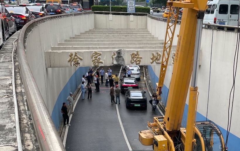 2日傍晚,记者接报后在现场看到,地道入口第一根水泥横梁已被彩条布包裹,地道入口下坡处停着一辆吊车,工作人员正在开展相关处置工作。受该起事件影响,徐家汇路地道西向东方向临时封闭,交警在地道入口疏导车辆绕行。正值晚高峰时段,徐家汇路、肇嘉浜路拥堵较为严重。