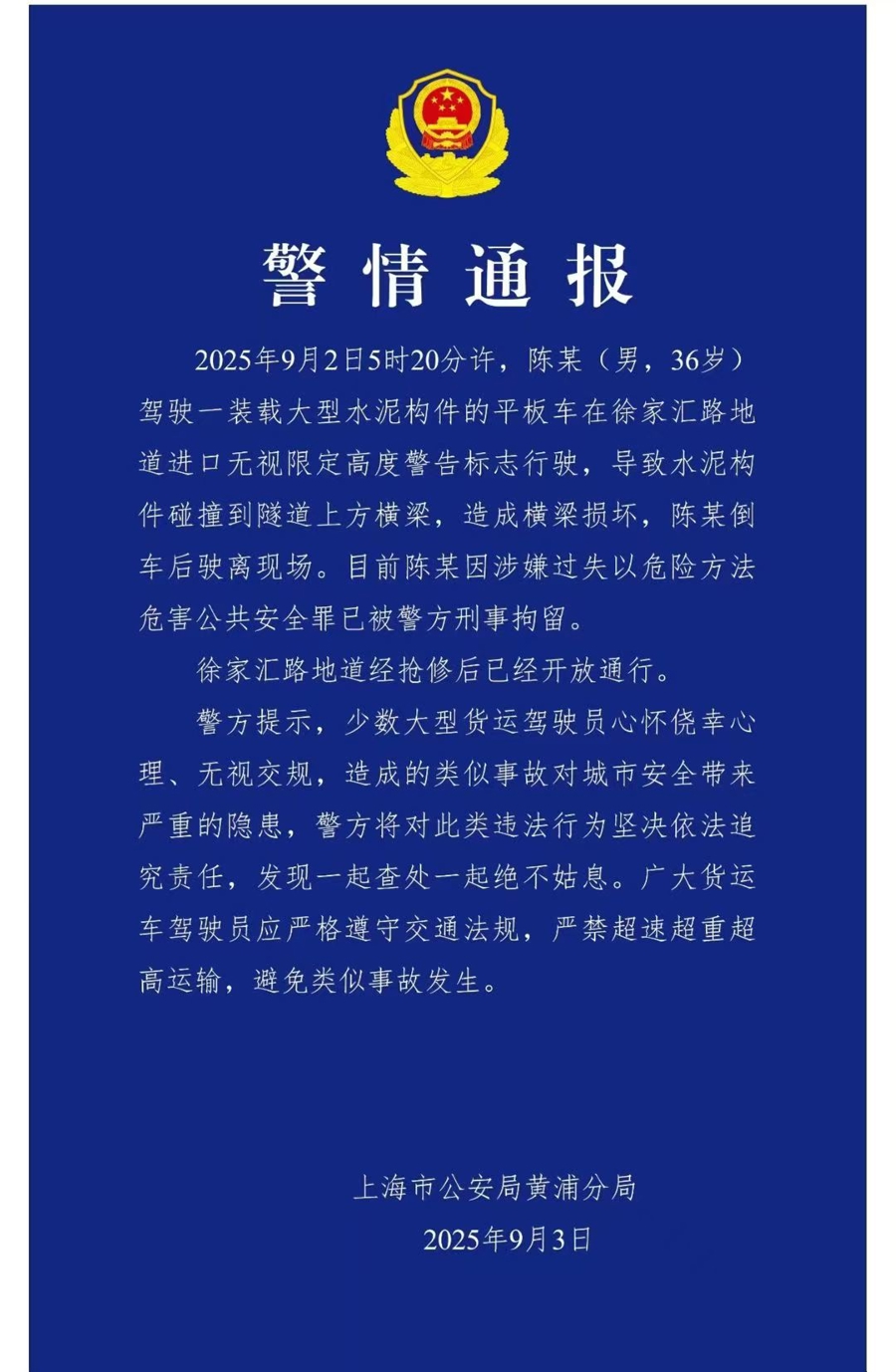 据黄浦警方通报,9月2日5时20分许,陈某(男,36岁)驾驶一装载大型水泥构件的平板车,在徐家汇路地道进口,无视限定高度警告标志行驶,导致水泥构件碰撞到隧道上方横梁,造成横梁损坏,陈某倒车后驶离现场。
