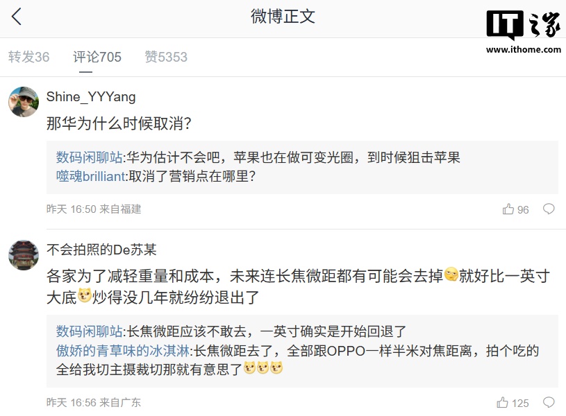 博主还在评论区回复了部分网友的问题:针对华为什么时候取消「可变光圈」设计,博主称“华为估计不会吧,苹果也在做可变光圈,到时候狙击苹果”;针对未来手机可能会为了减轻重量和成本而去掉长焦微距等配置的观点,博主表示“长焦微距应该不敢去,一英寸确实是开始回退了”。