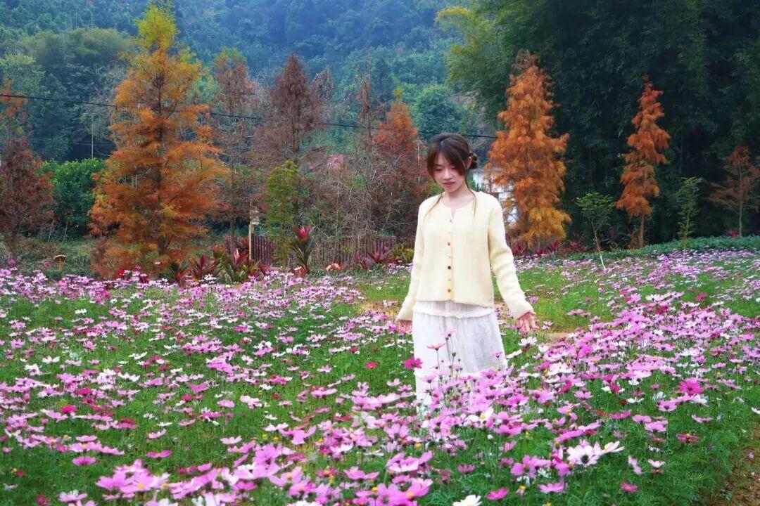 花海高度适中至腰际,穿浅色衣物更易出片——逆光俯身与花同框可获柔光滤镜效果,远眺花海与绿树、蓝天、落羽杉相映成画,轻松驾驭多种摄影风格。落羽杉挺拔的姿态与格桑花柔美的花姿相映成趣,既增添了景观的层次感,又强化了自然与人文交融的绝美画面。园内配套环形步道、亲子游乐区、露天草坪及休息长椅,赏花之余可沿溪散步、野餐露营,周末约亲友共赴这场“幸福之约”,文明赏花勿采摘,让美好留存更久。