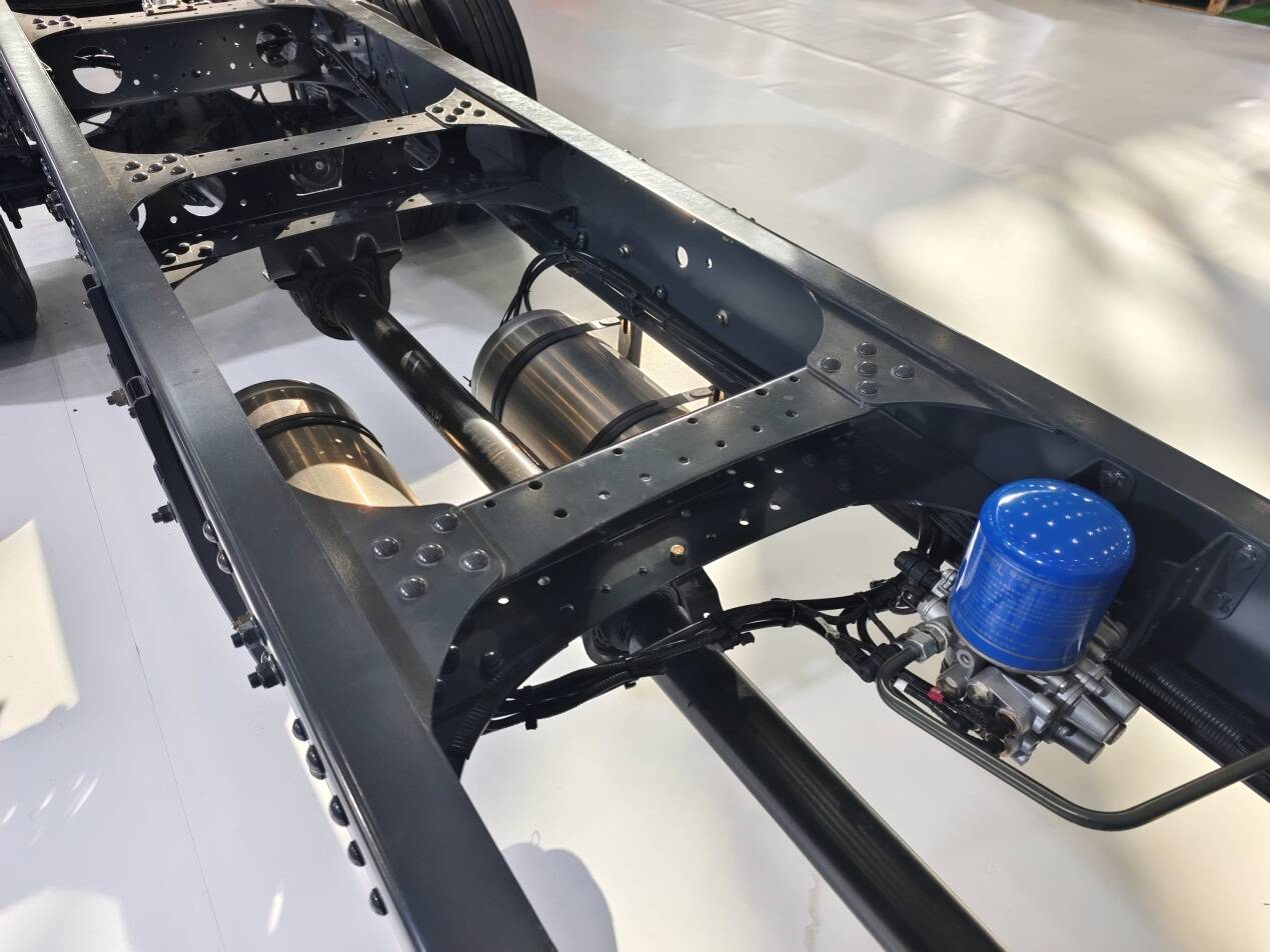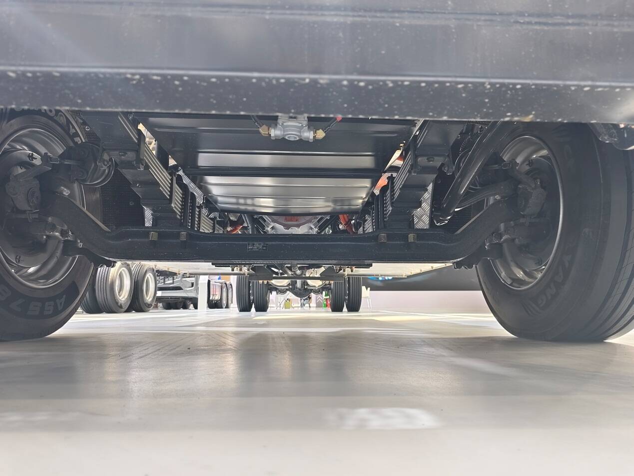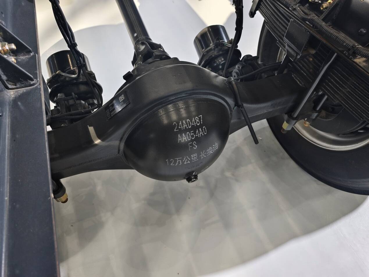 乘龙H5新能源大单桥底盘采用264mm车架,用料扎实,承载力好。车上搭载有电动空压机和60Ah免维护蓄电池,铝合金储气筒和干燥罐布置在车架中部内侧,使得车架两侧有较大空间,方便后续改装。4.2吨级前桥减震钢板8片,9吨级后桥减震钢板9+5片,这是为“多拉快跑”量身定制的硬核底子。