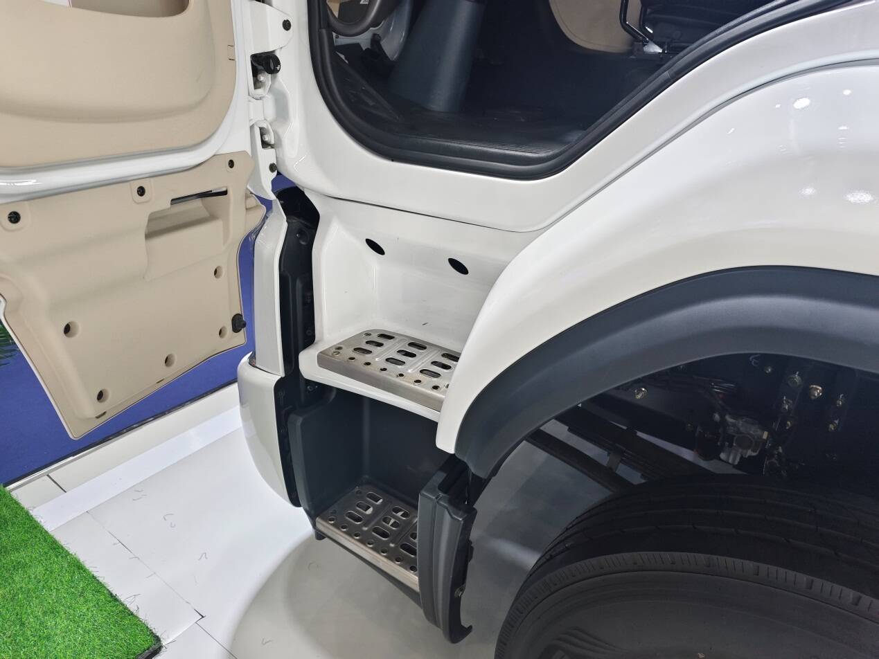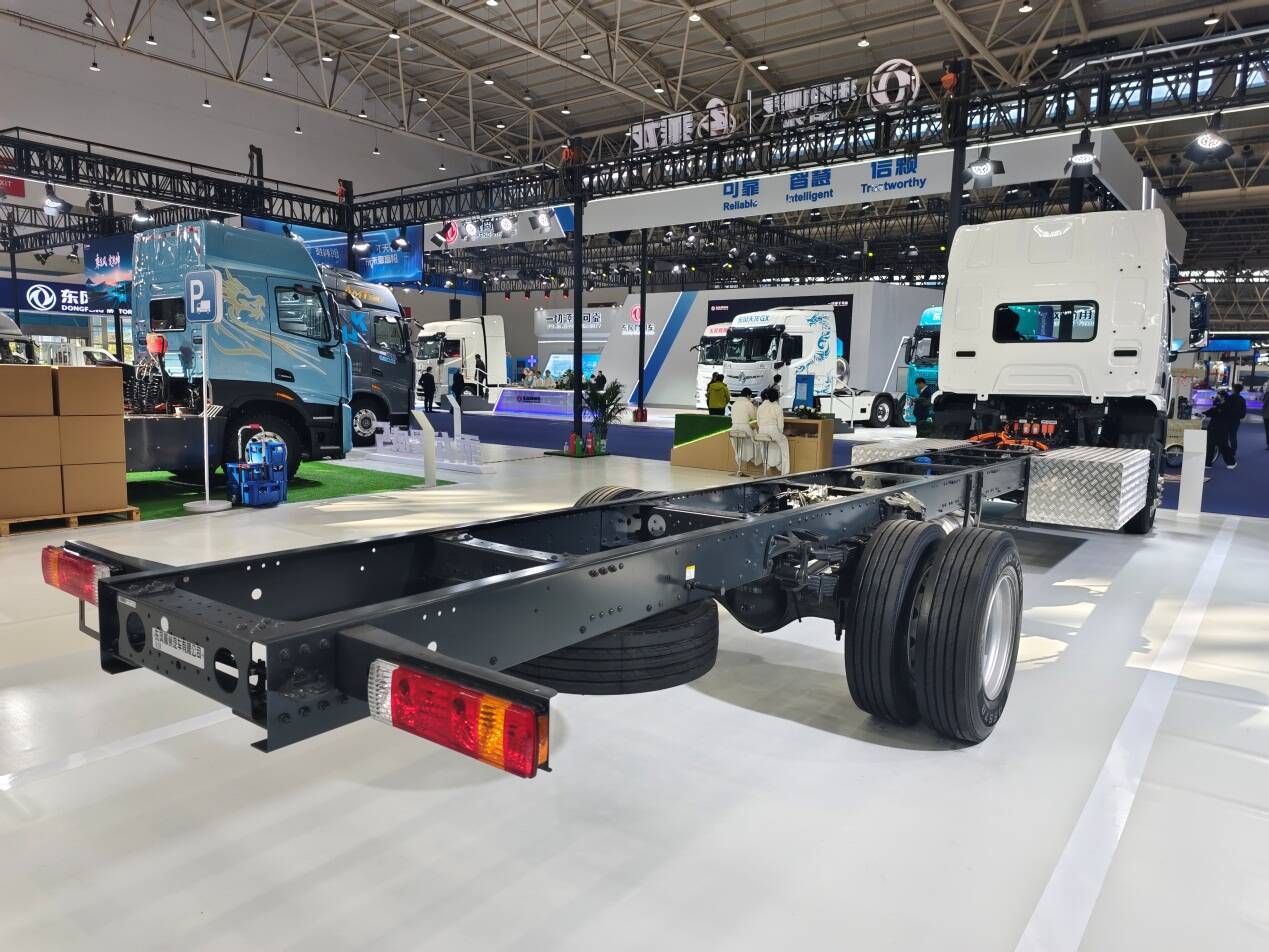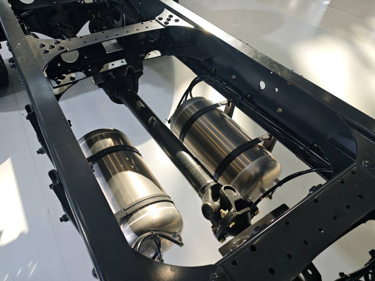 乘龙H5新能源大单桥底盘采用264mm车架,用料扎实,承载力好。车上搭载有电动空压机和60Ah免维护蓄电池,铝合金储气筒和干燥罐布置在车架中部内侧,使得车架两侧有较大空间,方便后续改装。4.2吨级前桥减震钢板8片,9吨级后桥减震钢板9+5片,这是为“多拉快跑”量身定制的硬核底子。