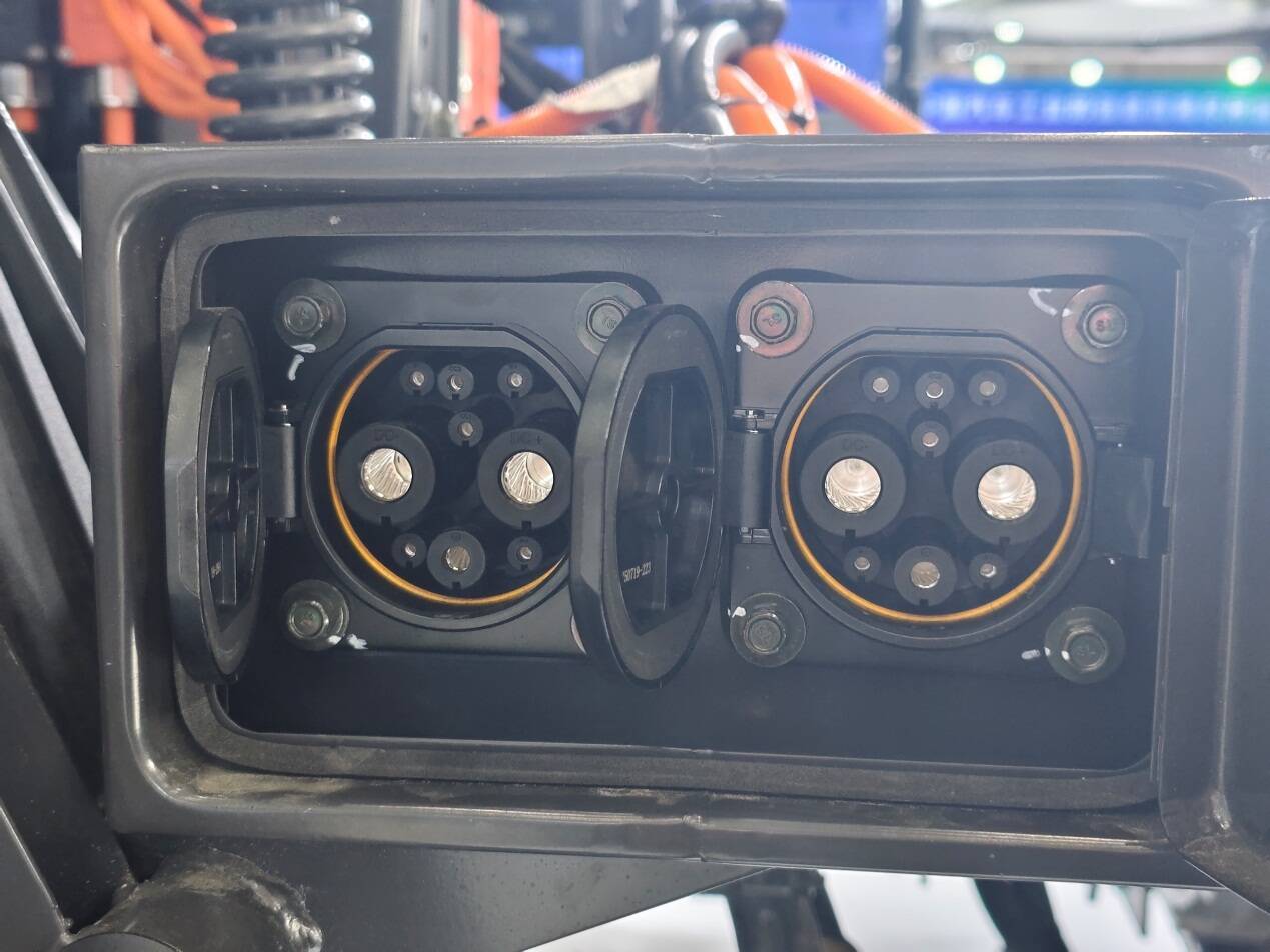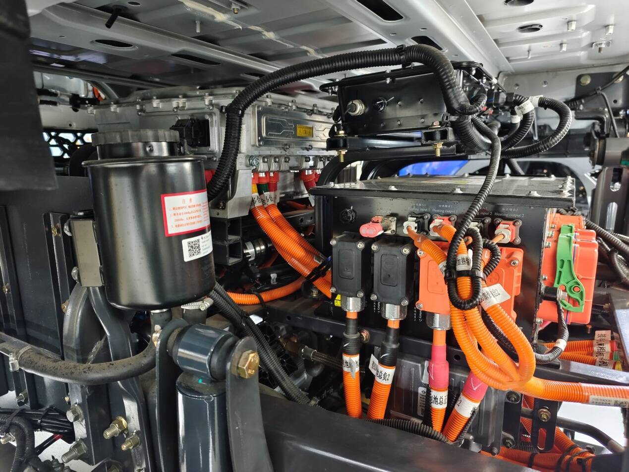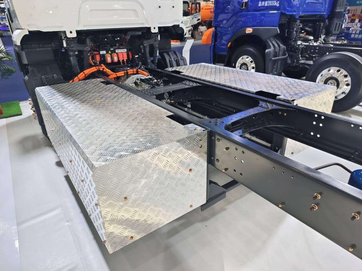 车上搭载宁德时代246.67kWh动力电池,动力电池额定电压540.9V,额定容量456Ah,整车电量约246.67kWh,CLTC续航里程220km。动力电池布置在车架左右两侧,电池包集成热管理系统,有助于节能。车辆采用双枪400A充电,可以在停车休息或装卸货物时随时充电,方便又节约时间。