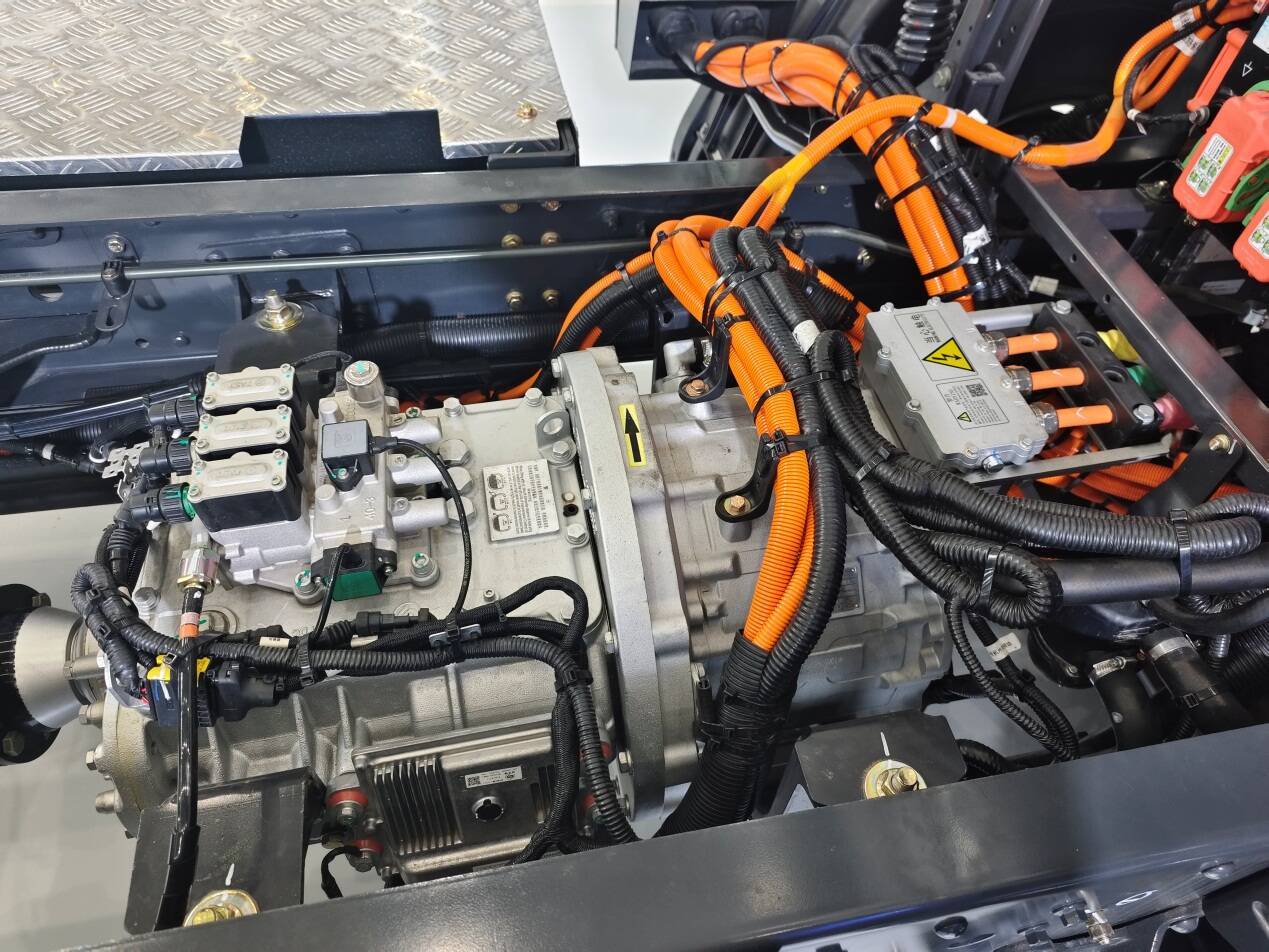 与电机匹配的是法士特6E95型6速铝壳AMT变速箱,自重轻,成熟可靠。驱动桥采用柳汽LQ24型9吨级后桥,主减速比4.875。前桥6万公里长换脂,后桥12万公里长换油,保养里程长,能为用户节省大量的维护时间和成本,为用户创造更大价值。