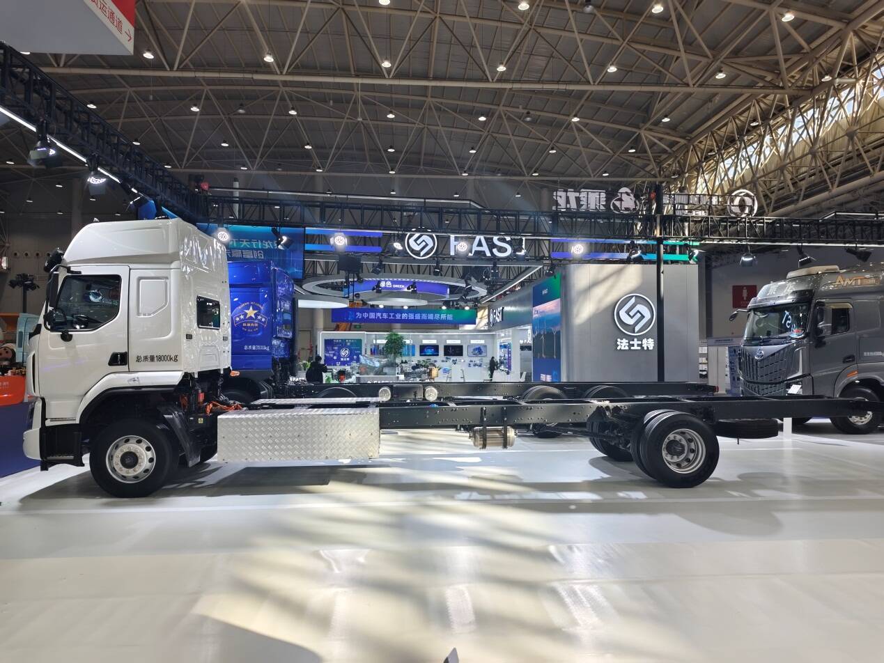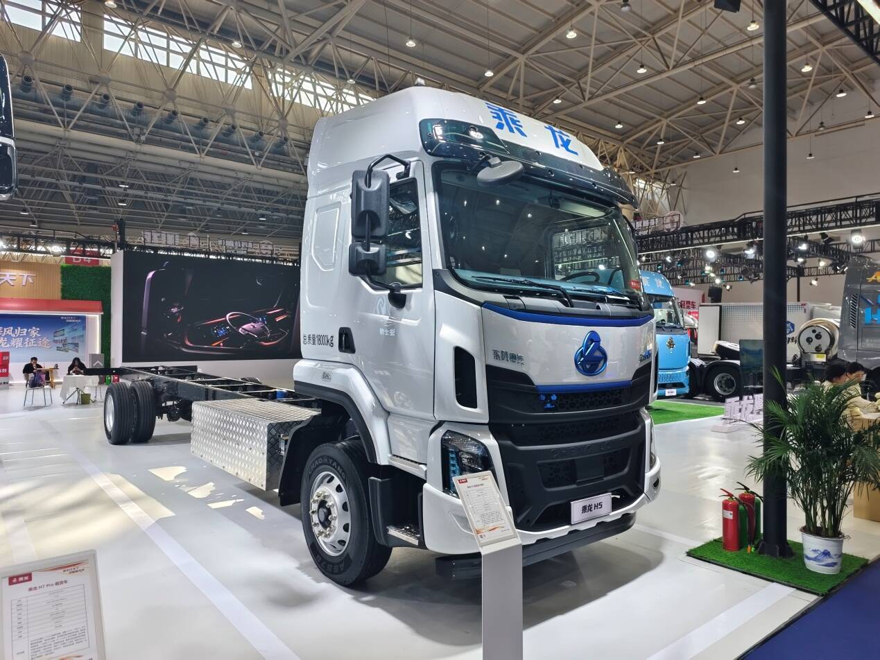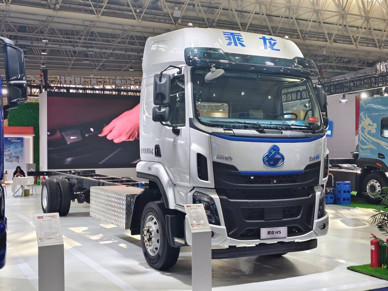 图片上这辆白色的新车就是乘龙H5 4×2新能源大单桥底盘,它延续了乘龙H5系列卡车造型美观、可靠实用的特点。车辆轴距长、吨位大、动力好,适合于改装成9.7米厢式货车从事公路物流运输使用,载货量大、环保高效,而且是新能源车不受限行影响。