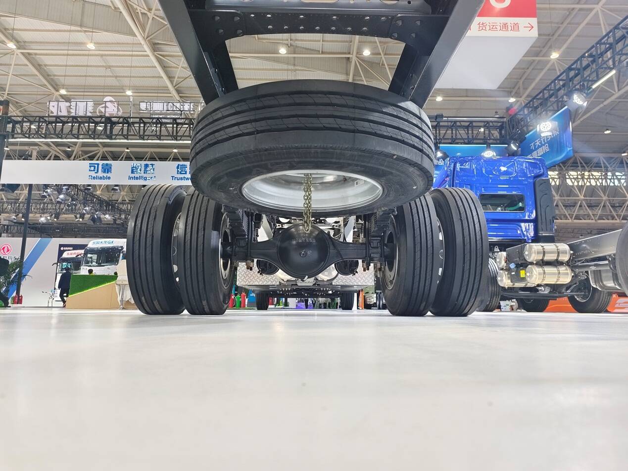 车尾设有备胎架,全车采用朝阳AS578 275/80R22.5型轮胎。
